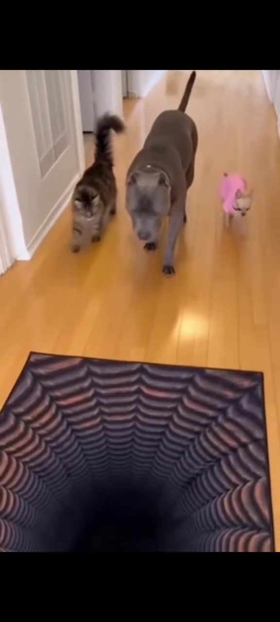 На видео кошка и две собаки стоят перед ковриком с 3D-рисунком, создающим эффект «пропасти». Большая собака решает своими методами выяснить, настоящая это пропасть или всего лишь иллюзия.