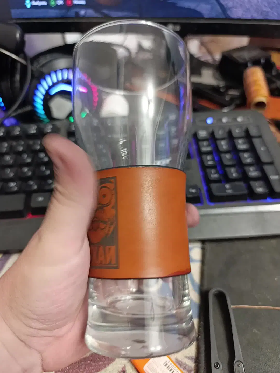 Простенькая гравировка на коже, покраска торцов и отверстия, чтобы это сшить на стакане