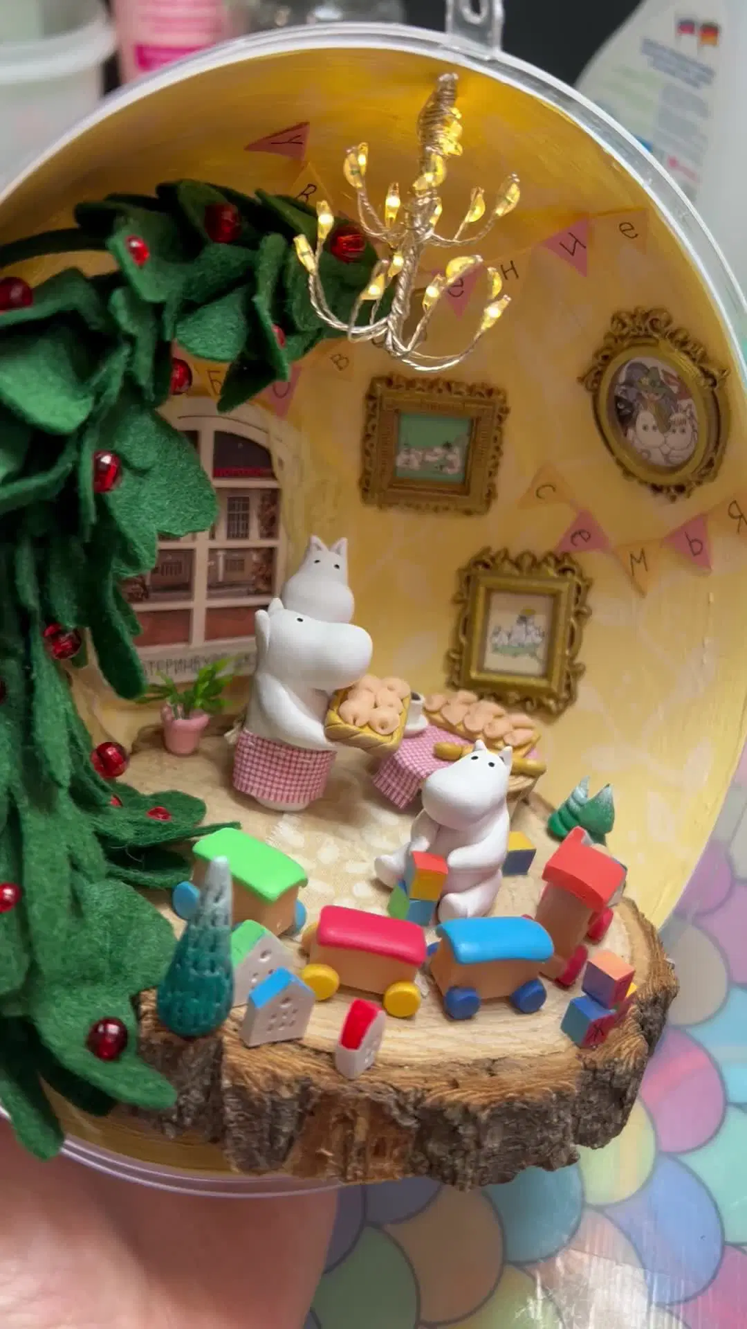 Шар рассказывает о семейных традициях одной семьи, поэтому мумины лепят пельмени, а на гирляндах написано уважение, семья, любовь) в живую смотрится конечно прикольнее, и нет возможности отснять нормально, за окном пасмурно, шар в обед уже заберут.