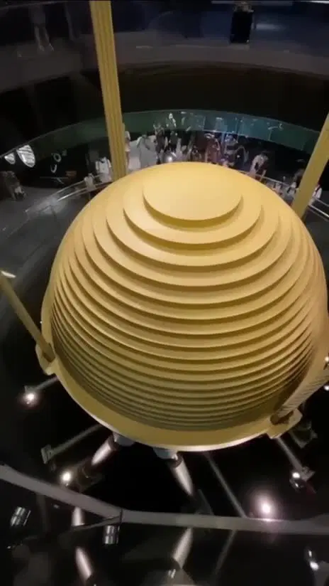 Небоскреб Taipei 101 имеет этот демпфер массой 728 тонн и диаметром 5,4 метра. Это помогает стабилизировать здание при сильном ветре и землетрясениях.