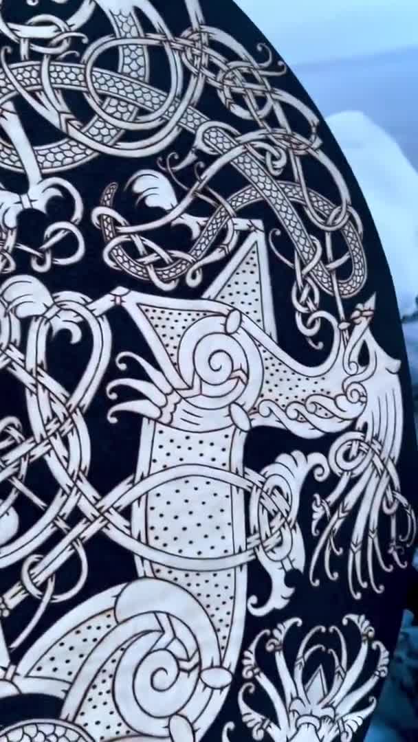 Скандинавский круглый щит вина-викинга с украшениями резьбой и рисунком