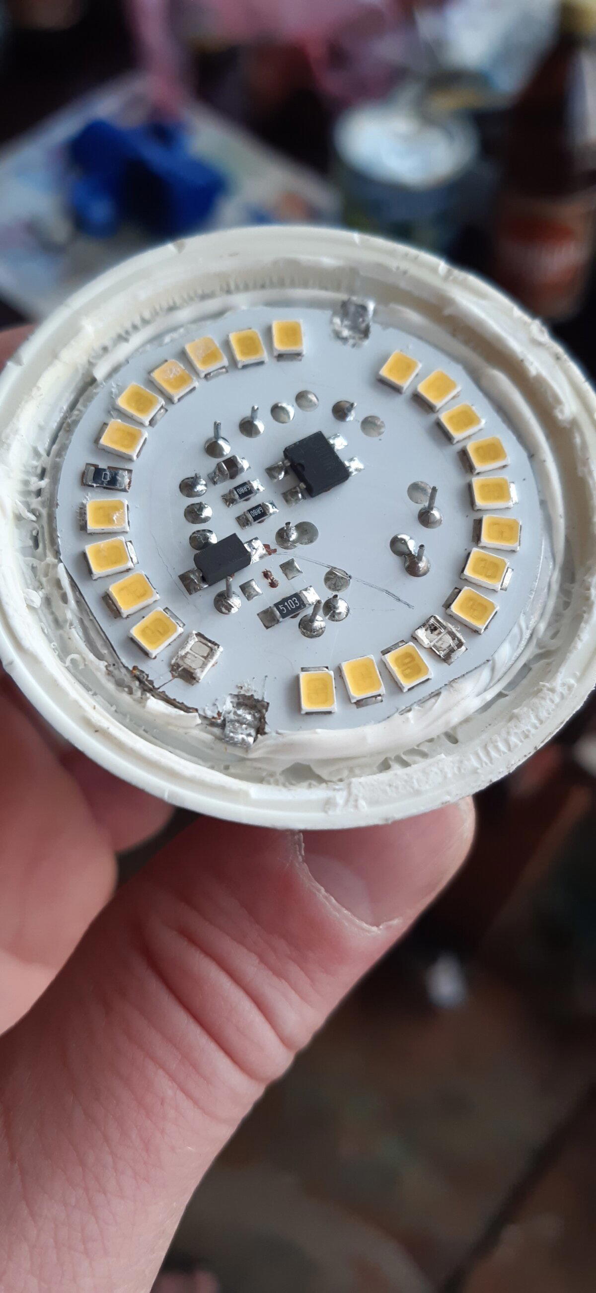 Напоследок вспомнил лайфхак по ремонту диодных лампочек, вычитанный здесь же на Пикабу, и решил повторить. Справа - горелый диод, слева случайно содрал